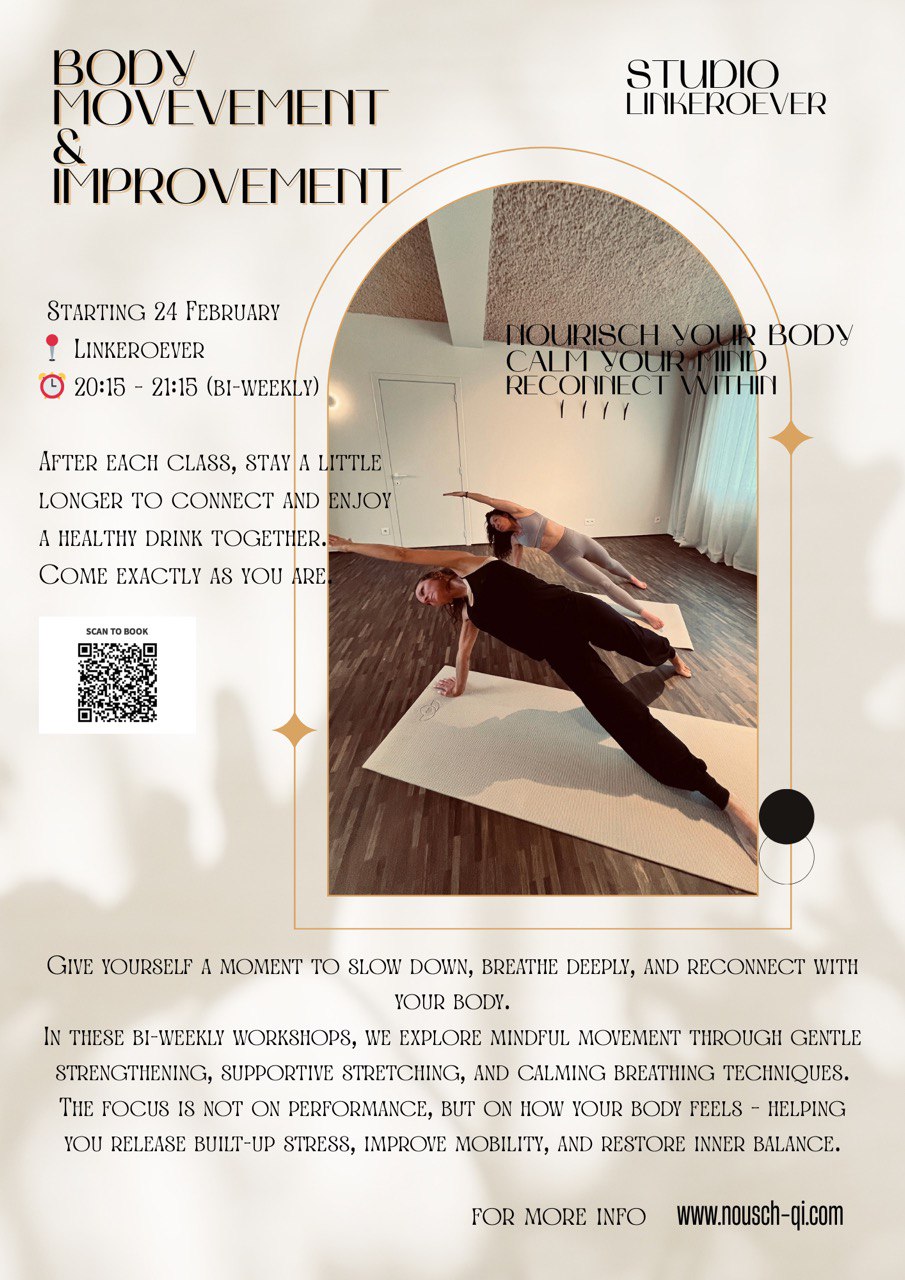 In these bi-weekly workshops, we explore mindful movement through gentle strengthening exercises, supportive stretches, and calming breathing techniques. The focus is not on performance, but on how your body feels — helping you release tension, improve mobility, and restore your inner balance.