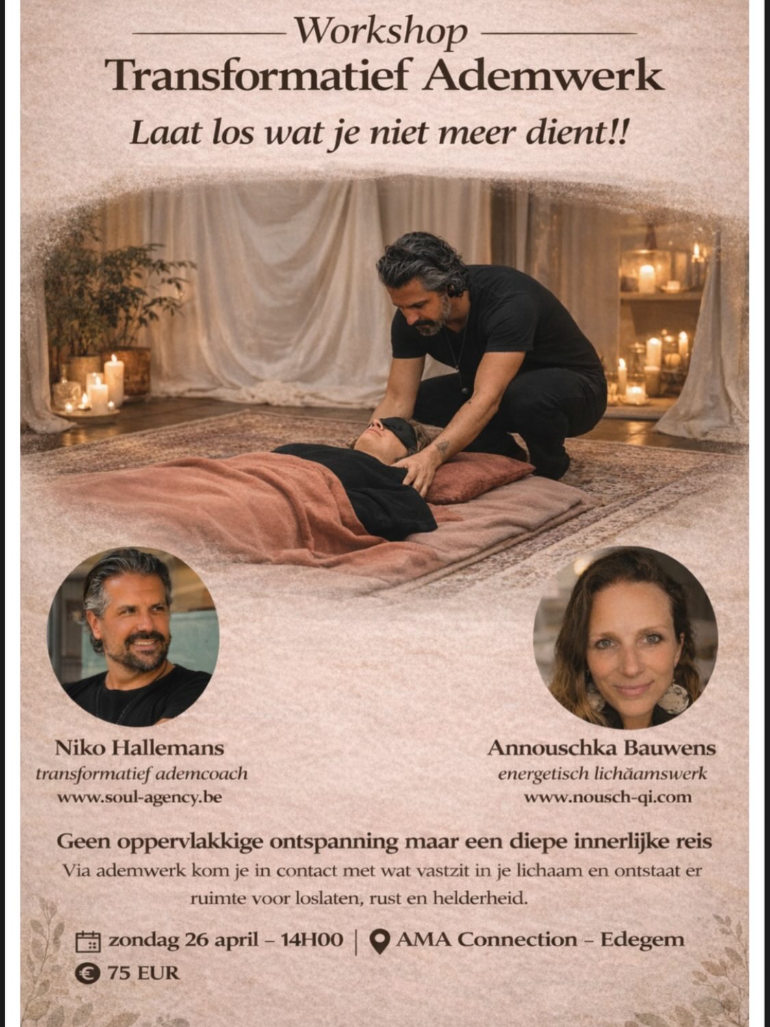 During this workshop, Niko Hallemans and Annouschka Bauwens guide you through a transformative experience using breath and energy.